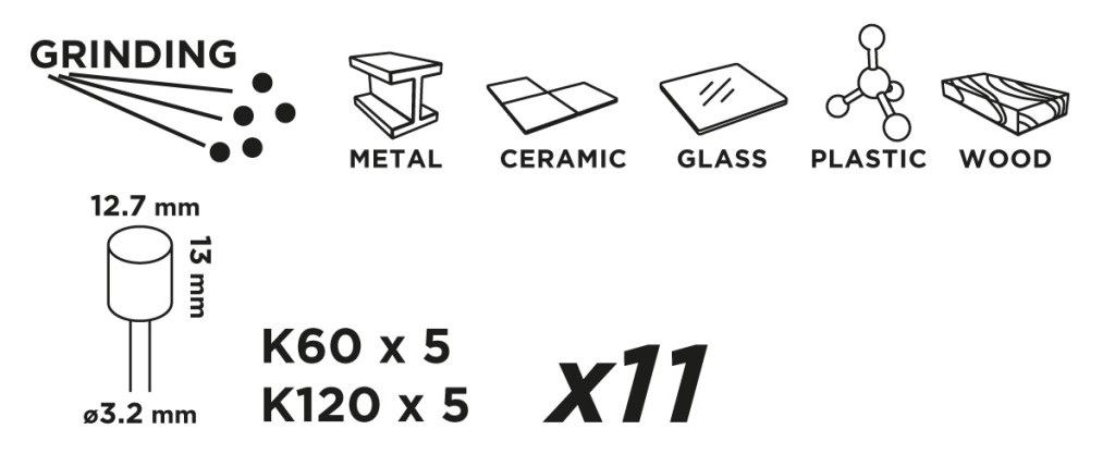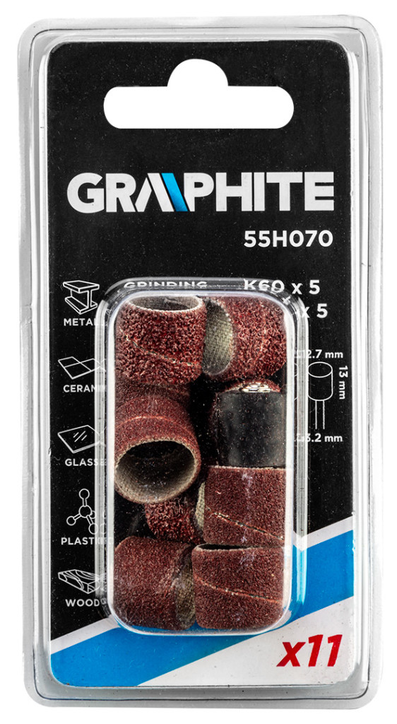 Csiszolóhüvely GRAPHITE (cikkszám: 55H070) készlet 10 darab a mini csiszolóhoz, átmérője 12,7 mm és a szemcsenyagyság K60 és K120. Alkalmas fémek felületének csiszolására, alakítására és előkészítésére,ötvözetek, kerámiák, lemezek, kő, üveg, műanyagok és üvegszál. A rozsdát eltávolítja és a vágott felületeket is csiszolhatja vele.