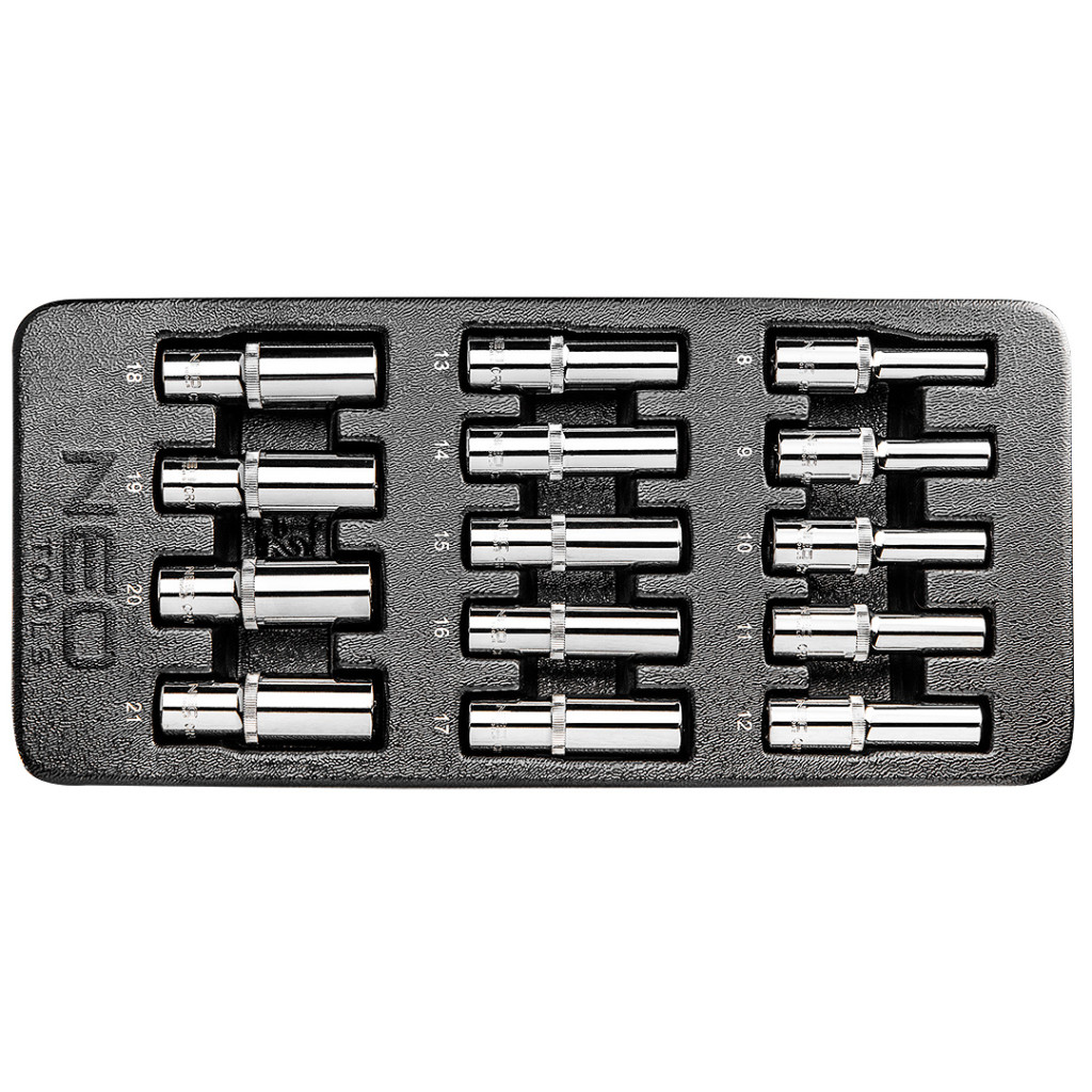1/2" hosszú dugókulcsok, 8-21 mm, 14 db-os készlet NEO (Ref.sz. 84-243) CrV acél, 25 év garancia, méretek: 8, 9, 10, 11, 12, 13, 14, 15, 16, 17, 18, 19, 20, 21 mm
