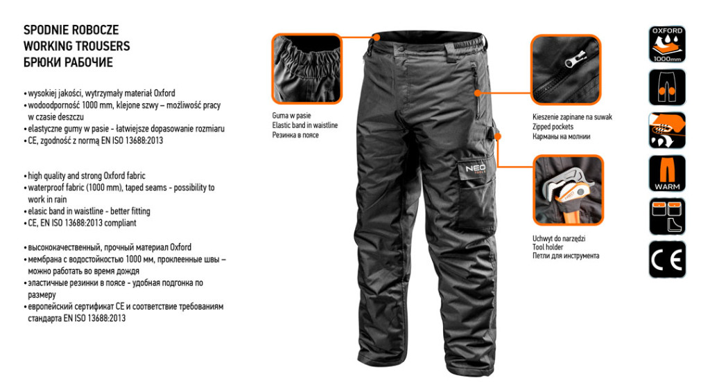 NEO Bélelt munkanadrág, magas minőségű, tartós Oxford 300D anyagból készül, könnyű poliészter béléssel, biztosítva a komfortot a fagyos napokban. Az erősített varrás és az 1000 mm vízállóságú anyag lehetővé teszi a munkavégzést az esőben. A rugalmas gumis derék révén a méret könnyebben illeszkedik az alakhoz. A zsebek könnyen hozzáférhetőek, elférnek benne a munka közben szükséges szerszámok. A szerszámtartók nagy terhelést is kibírnak. A termék EN ISO 13688:2013 szabvány szerinti kivitelezése és az európai tanúsítványa minőségének garanciája.