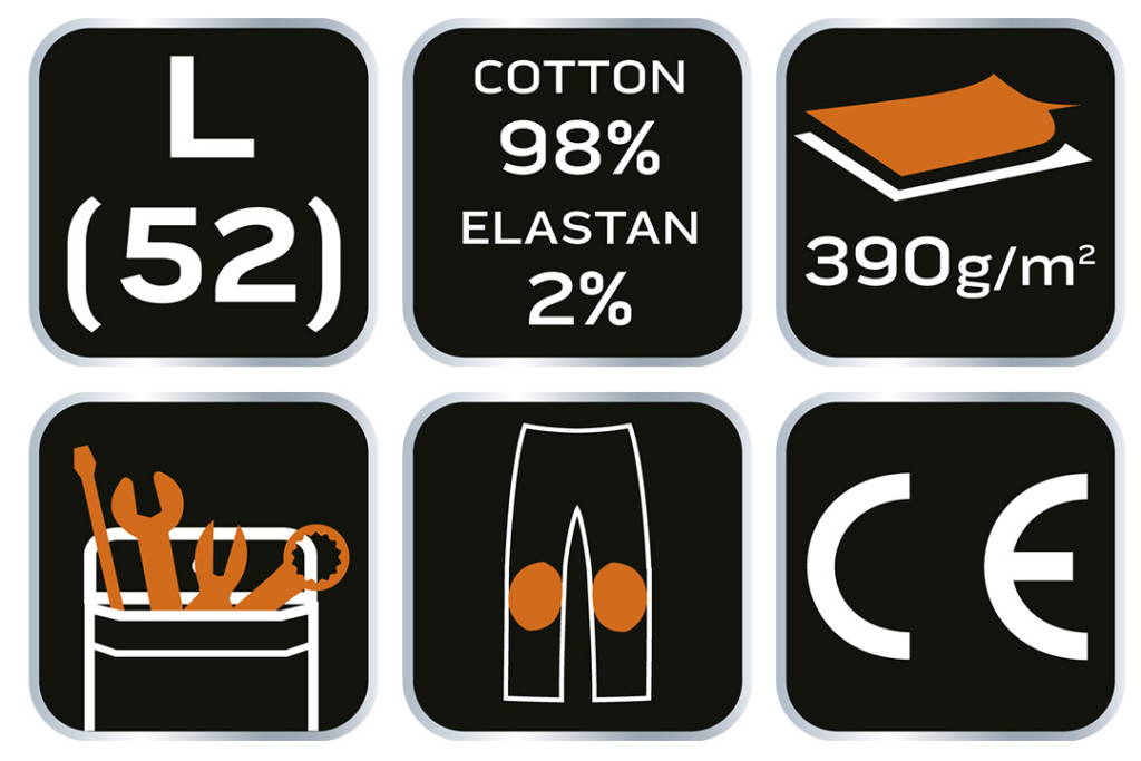 Munkanadrág DENIM, erősítés a térdén, méret L, az elasztán hozzáadása jobb illeszkedést és nagyobb viselési kényelmet nyújt, pamut Oxforddal erősített térdvédő zseb, multifunkcionális és tágas zsebek, pamut Oxforddal erősített zsebek, pamut Oxford panel h