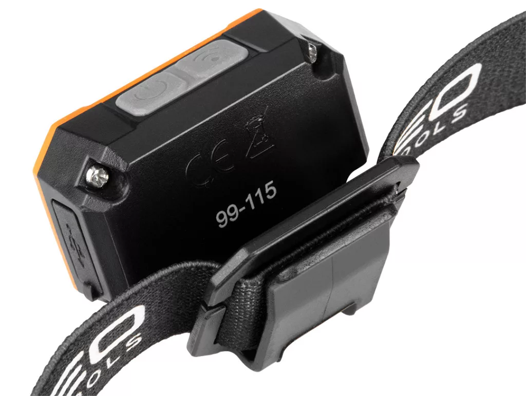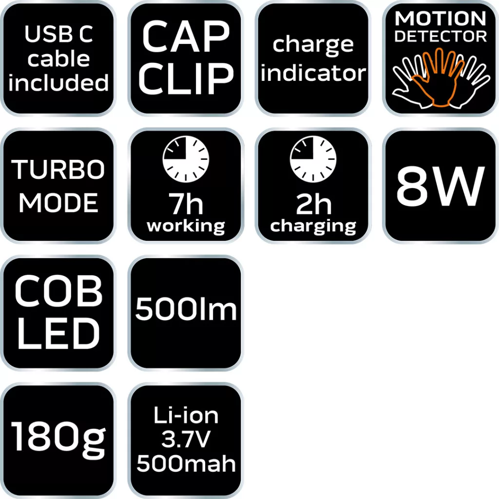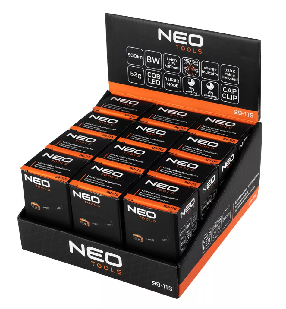 NEO 99-115 Fejlámpa, tölthető, 500 lum fényerő, COB led, Rendelési egység: 12db. 500 lm fényerő és 8 W teljesítmény jellemzi. COB LED-del és USB C töltőporttal felszerelve egy modern világítási lehetőség, amely számos helyzetben nélkülözhetetlen. A lámpa egy 250 mAh-s Li-Po 3,7 V-os akkumulátorral működik, amely 100%-os töltöttség mellett 3,5 óra, 50%-os töltöttség mellett pedig 7 óra üzemidőt biztosít. Töltési ideje mindössze 2 óra. A készülék praktikus funkciója a mozgásérzékelő gesztusokkal történő aktiválása, az akkumulátor töltöttségének kijelzője és a TURBO funkció (100% = 500 lm/400 lm, 50% - 200 lm). A NEO TOOLS zseblámpa rendelkezik a piros és zöld fény lehetőségével, ami vészhelyzetekben hasznos. Állítható gumi fejpánttal, sapkakapoccsal és USB C kábellel kínáljuk. Alacsony, 180 g-os súlyának köszönhetően ideális kültéri és szabadtéri tevékenységekhez.