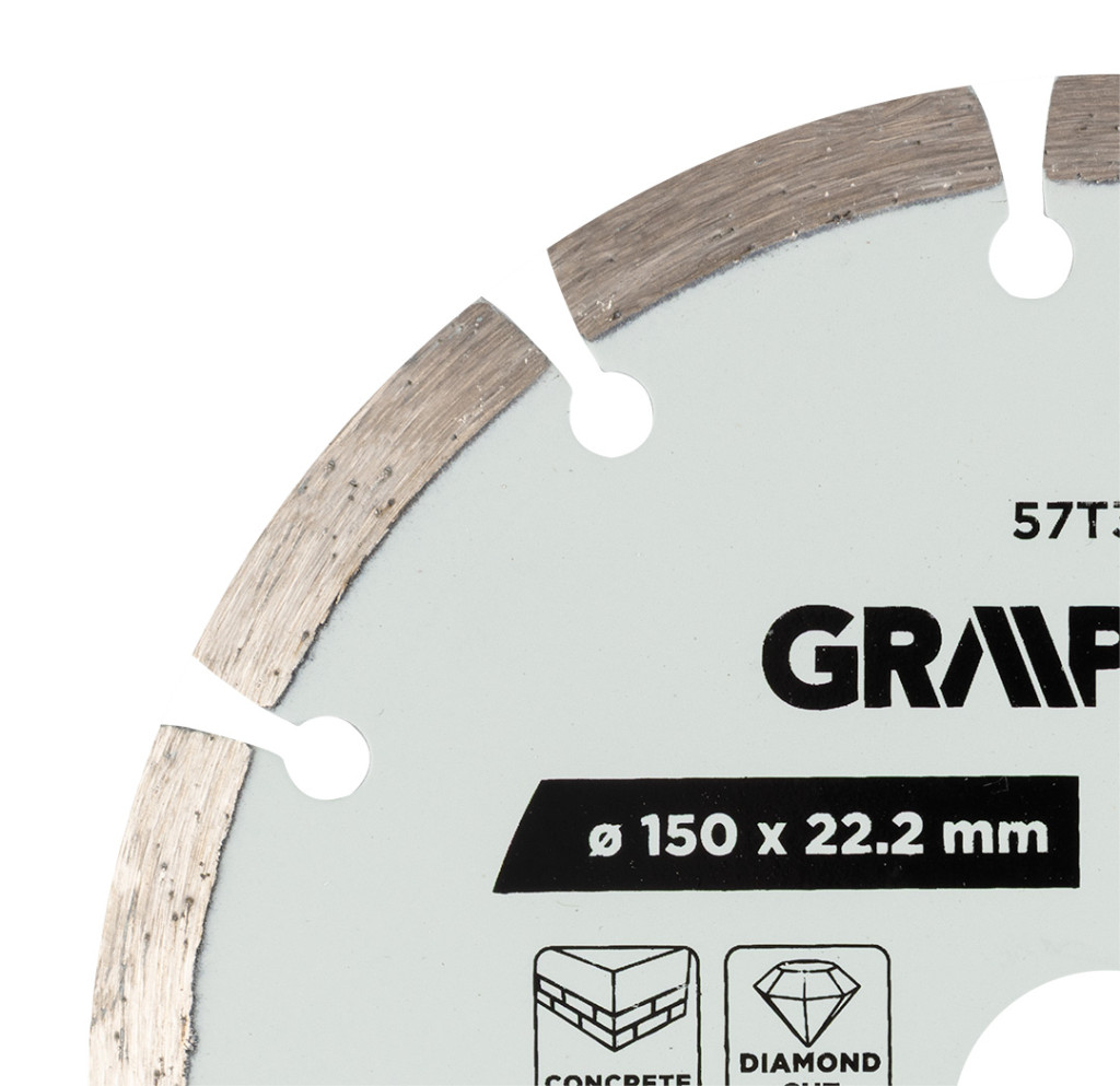 GRAPHITE 57T309 Gyémánt vágókorong 150x22,2mm szegmentált, száraz. Praktikus redukciós gyűrűt tartalmaz. A vágószegmens 7 mm magas és 2,2 mm széles. A tárcsa maximális sebessége 10 000 fordulat/perc, ami 80 m/s-nak felel meg. A GRAPHITE tárcsa megfelel az EN 13236 szabvány követelményeinek, és gránit, beton, tégla, kő és márvány vágására készült.