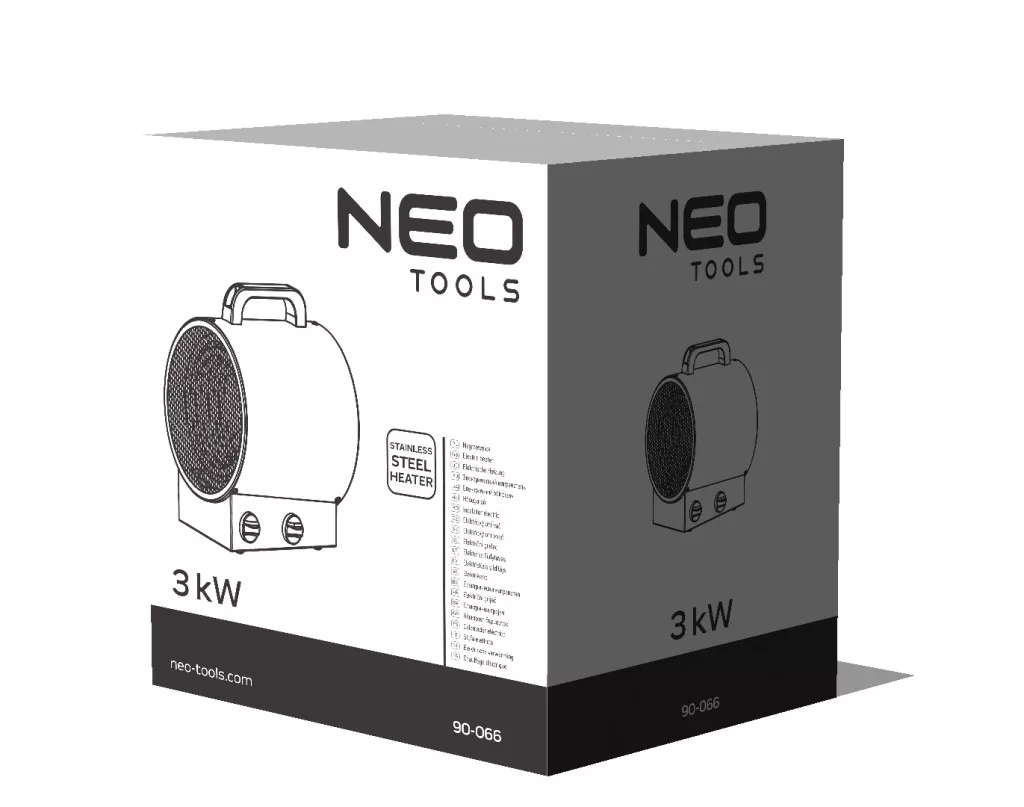 A NEO 90-066 egy olyan elektromos léghevítő, amelyet ipari környezetekben alkalmaznak, például műhelyekben, garázsokban, vagy akár üzletekben. Ez a készülék erős és megbízható, 3 kW teljesítményű, ami elegendő ahhoz, hogy hatékonyan fűtse a választott helyiséget. A fűtőelem rozsdamentes acélból készült, ami hosszú élettartamot és védelmet nyújt a túlmelegedés ellen. Az állítható termosztát lehetővé teszi a felhasználók számára, hogy pontosan beállítsák a kívánt hőmérsékletet. Emellett a készülék túlmelegedés elleni védelemmel is rendelkezik, ami növeli a biztonságot. A léghevítő szabadonálló és könnyen hordozható, a szigetelt műanyag fogantyúnak köszönhetően. A porfestett fémház pedig extra védelmet nyújt a készüléknek a rozsda ellen. A ventilátor gyorsan és egyenletesen oszlatja szét a meleget a helyiségben, így biztosítva a hatékony fűtést. Összességében ez a léghevítő ideális választás lehet az ipari környezetekben, biztosítva a megbízható és hatékony teljesítményt.