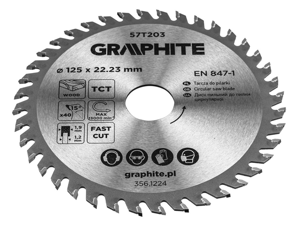 GRAPHITE 57T203 Körfűrészlap, keményfém fogakkal, 125 x 22,2 mm, 40 fogú. Vágási szélessége 1,9 mm, a fogszög 15°. A maximális fordulatszám 13 500 fordulat/perc. Vágási típus: nagysebességű vágás. A tárcsa megfelel az EN 847-1 szabványnak. 22,2/20 mm-es és 22,2/16 mm-es redukciós gyűrűk tartozék. Alkalmas fa és faalapú anyagok, például rétegelt lemez, forgácslap és MDF vágására. A csomagban található redukciós gyűrűk lehetővé teszik a tárcsa használatát a legtöbb fűrésztipussal.