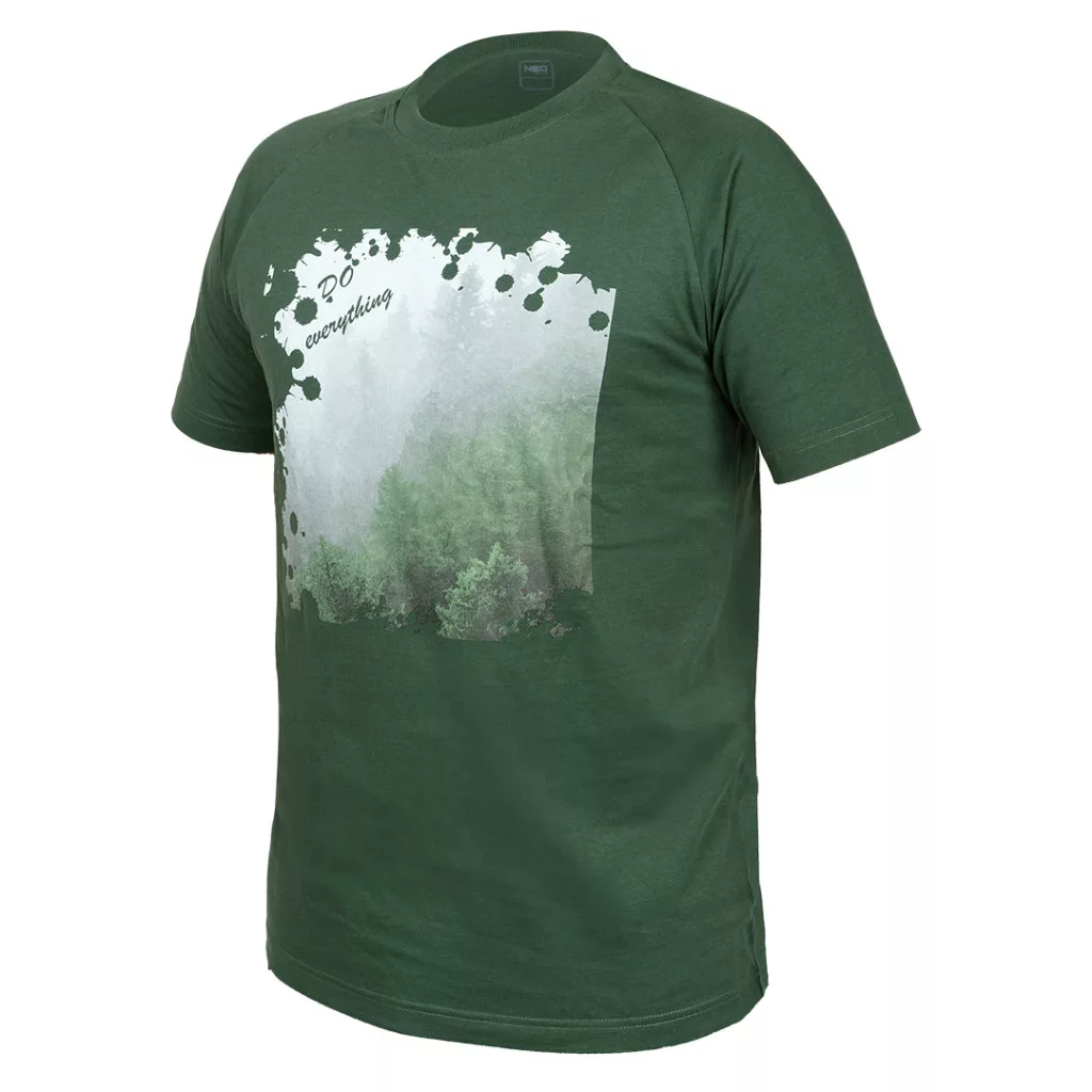 NEO 81-644 MunkaMunkavédelmi póló, OUTDOOR, erdő. Egy kényelmes, rövid ujjú póló, amelyet az olívazöld szín és nyomtatott minta jellemez. A fotónyomtatott grafika egy erdőt ábrázol. A póló 100% puha pamutból készült. Súlya 180 g/m2 . Raglan ujjak és kerek nyakkivágás elasztikus szalaggal biztosítja a kényelmes viseletet. A nyakrészen lévő nyomtatott logó és a névtábla hangsúlyozza a részletekre való odafigyelést. A NEO TOOLS póló egyedi, saját tervezésű, a lehető legmagasabb minőséget kínálja a mindennapi viselethez.