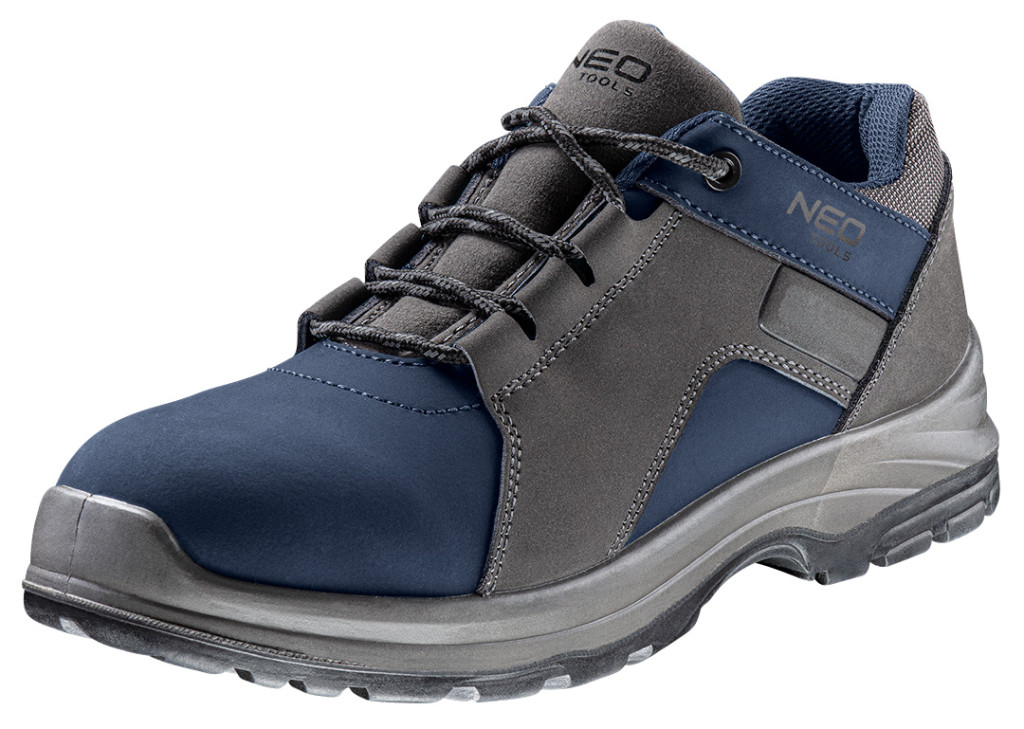 NEO professzionális munkacipő. Kényelmes, kiváló minőségű nubukbőrből készült, igényes belső szövettel. Jellemzői: fémmentes, antisztatikus, ütéselnyelő sarokkialakítás, a kétsűrűségű PU anyagból készült cipőtalp kopásálló és csúszásálló, fényvisszaverő cérnával készült cipőfűző, O2 SRC besorolású, CE tanúsítvány, megfelel a EN ISO 20347:2012. szabványnak