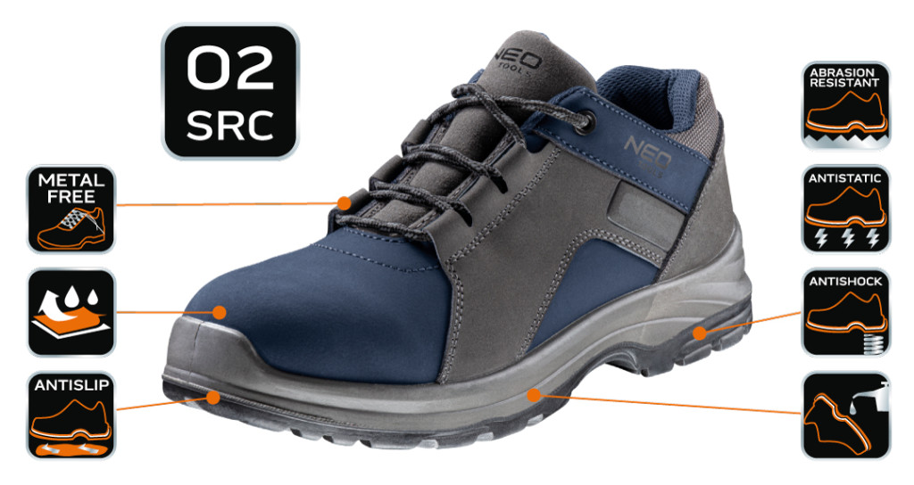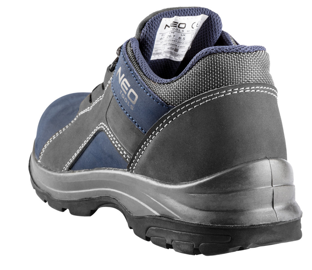 NEO professzionális munkacipő. Kényelmes, kiváló minőségű nubukbőrből készült, igényes belső szövettel. Jellemzői: fémmentes, antisztatikus, ütéselnyelő sarokkialakítás, a kétsűrűségű PU anyagból készült cipőtalp kopásálló és csúszásálló, fényvisszaverő cérnával készült cipőfűző, O2 SRC besorolású, CE tanúsítvány, megfelel a EN ISO 20347:2012. szabványnak