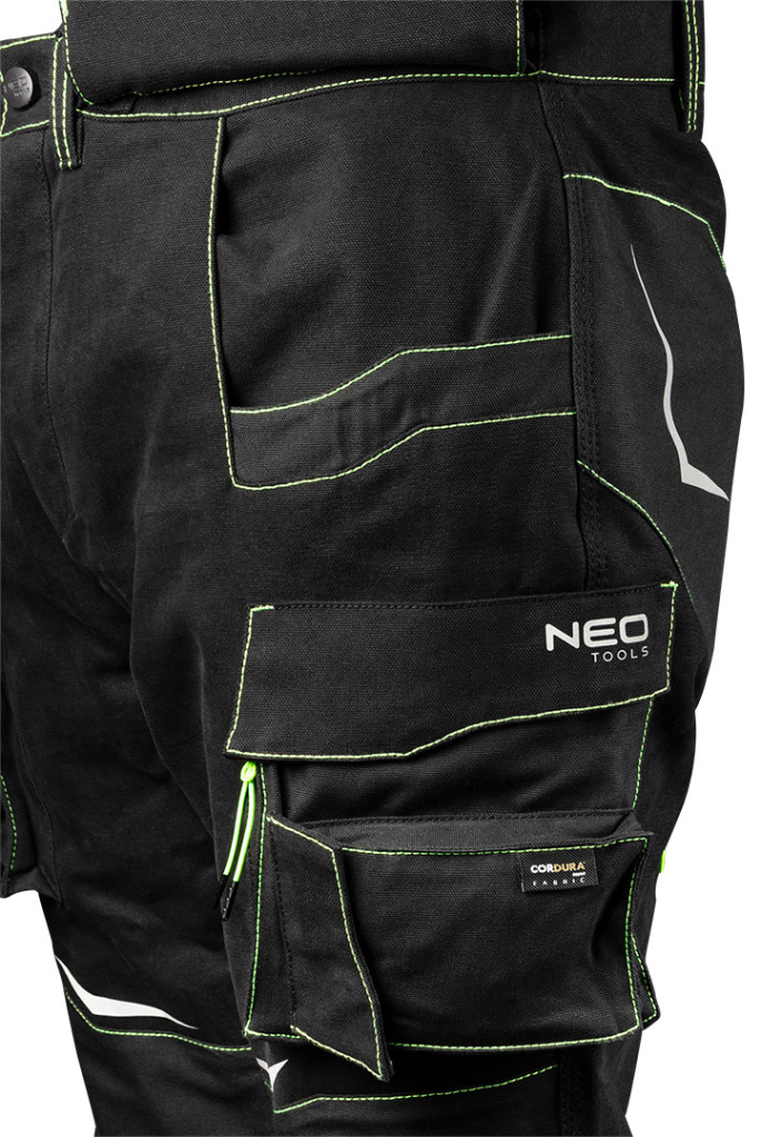 A NEO Premium PRO munkanadrág. Anyaga:100% Canvas pamut, 425 g/m2 súlyú, Cordura NYCO 75% pamut, 25% nylon, 272 g/m2 súlyú. Cordura NYCO anyaggal megerősítve a zsebeken, a térdeken, a háton és a lábszárak alján. A nadrág fekete színű, a varrások kontrasztos neonzöld színüek. YKK cipzárral és 3M fényvisszaverő nyomatokkal van ellátva. Háromszoros varrással rendelkeznek.18 zseb található rajta: 3 cipzáras, 4 mágneses záródású, levehető zseb-7 rekesszel.Megtalálható rajta egy azonosító zseb és szerszámhorgokkal is rendelkezik.A profilozott térdek és a NYCO Cordurával megerősített lábszárak, a nadrág meghosszabbításának lehetőségével, hozzájárulnak a kényelemhez. Belül van egy bevart, csúszásgátló nyomtatással ellátott gumiöv, és egy további cipzár, amely lehetővé teszi, hogy a sorozatból származó dzsekivel kombináljuk. A lábak hátsó részén egy fedett cipzáras szellőző is található. Az azonosító címke megkönnyíti a munkahelyi azonosítást. A nadrág magas minőségű. A NEO márkát szakemberek és barkácsolók számára ajánljuk. A Premium PRO nadrág CE tanúsítvánnyal rendelkezik.