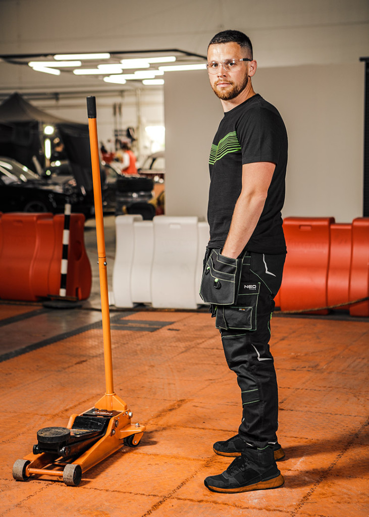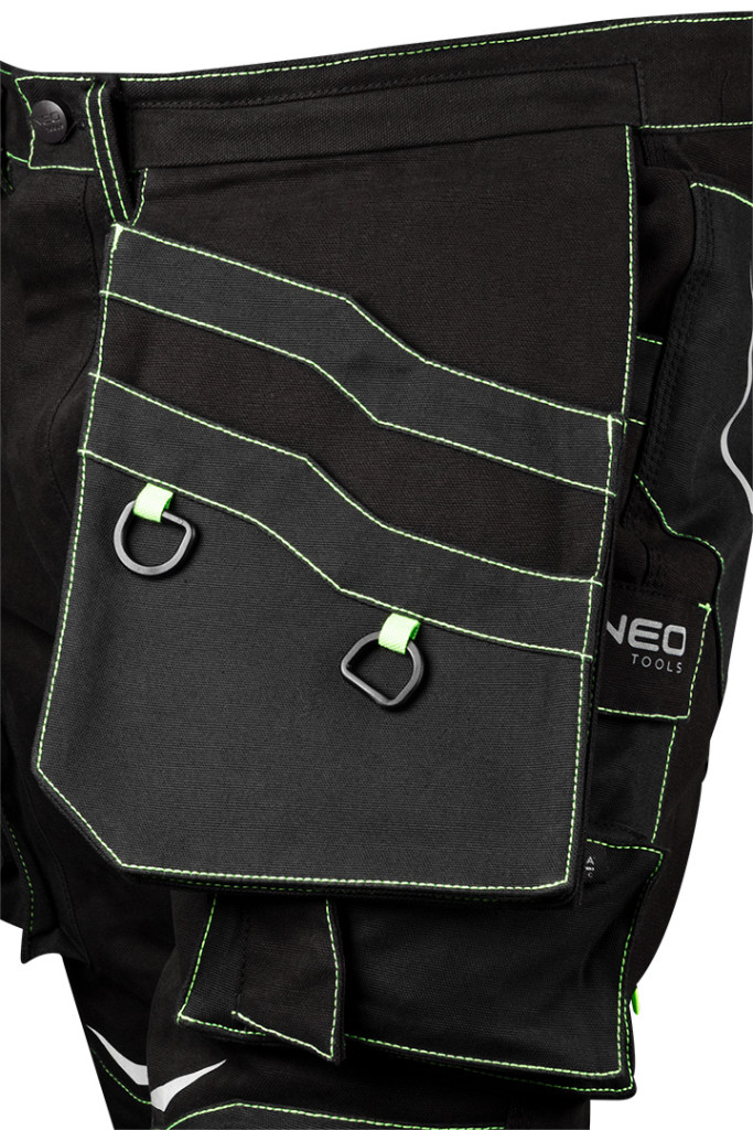 A NEO Premium PRO munkanadrág. Anyaga:100% Canvas pamut, 425 g/m2 súlyú, Cordura NYCO 75% pamut, 25% nylon, 272 g/m2 súlyú. Cordura NYCO anyaggal megerősítve a zsebeken, a térdeken, a háton és a lábszárak alján. A nadrág fekete színű, a varrások kontrasztos neonzöld színüek. YKK cipzárral és 3M fényvisszaverő nyomatokkal van ellátva. Háromszoros varrással rendelkeznek.18 zseb található rajta: 3 cipzáras, 4 mágneses záródású, levehető zseb-7 rekesszel.Megtalálható rajta egy azonosító zseb és szerszámhorgokkal is rendelkezik.A profilozott térdek és a NYCO Cordurával megerősített lábszárak, a nadrág meghosszabbításának lehetőségével, hozzájárulnak a kényelemhez. Belül van egy bevart, csúszásgátló nyomtatással ellátott gumiöv, és egy további cipzár, amely lehetővé teszi, hogy a sorozatból származó dzsekivel kombináljuk. A lábak hátsó részén egy fedett cipzáras szellőző is található. Az azonosító címke megkönnyíti a munkahelyi azonosítást. A nadrág magas minőségű. A NEO márkát szakemberek és barkácsolók számára ajánljuk. A Premium PRO nadrág CE tanúsítvánnyal rendelkezik.
