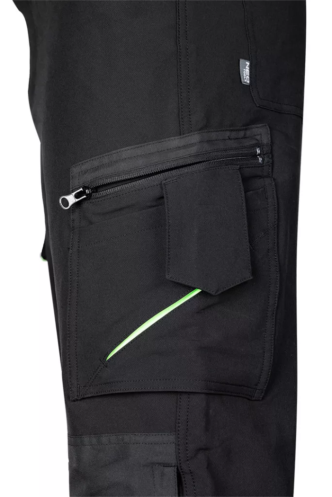 NEO 81-295-1 MUNKÁSNADRÁG, MIX&MATCH, 4 IRÁNYÚ SZTRECCS, 230G/M2, FEKETE-ZÖLD. Egy nadrág a Mix&Match vonalból, amely arra ösztönzi, hogy a kiválasztott munkaruházat elemeit a saját ízlése szerint állítsa össze. A nadrág tartós 4 irányú sztreccs anyagból készült, amely 92% poliészterből és 8% spandexből áll, súlya 230 g/m2. Fekete, praktikus színű, energikus zöld elemekkel. A dupla varrás, a térdvédőknek helyet adó térdmegerősítések, a lábszár alsó részén található megerősítések és a profilozott térdek hozzájárulnak e modell kivételes tartósságához és robusztusságához. A fényvisszaverő nyomtatásnak köszönhetően ideális a sötétedés utáni munkavégzéshez. A szerszámcsipesz és a névtábla viszont növeli a komfortot, és megkönnyíti a ruházat azonosítását a professzionális környezetben. A NEO TOOLS munkanadrág megfelel a CE EN ISO 13688:2013 szabványnak.
