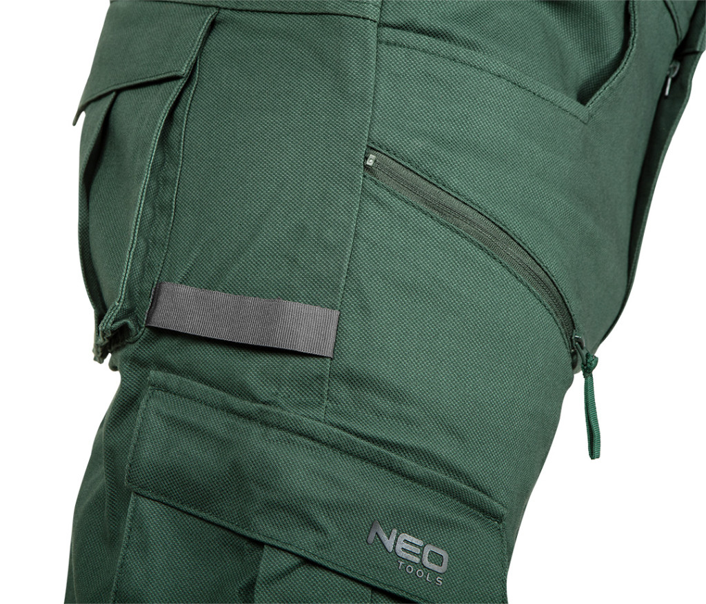 NEO Munkásnadrág, OUTDOOR, zöld, 80% pamut. Zöld színű nadrág, amelyet 80% pamut, 17% poliészter és 3% spandex dobby szövésű anyag jellemez. Súlya 280 g/m2. Elasztikus derékpánttal, valamint cipzáras és gombos záródással rendelkezik. A NEO TOOLS nadrág ergonomikus elülső zsebekkel, további cipzáras combzsebekkel és térd fölötti térdzsebekkel rendelkezik. A profilozott térd nagyobb kényelmet biztosít. A stopperrel ellátott lábszárszegély garantálja a mozgásszabadságot, valamint a szél és a hideg elleni védelmet. A szerszámkapocs viszont több tárolási lehetőséget és könnyű hozzáférést biztosít a tartozékokhoz. A NEO TOOLS nadrág a térd fölötti zsebtapaszon nyomtatott logóval, valamint a jobb személyre szabhatóság érdekében névtáblával rendelkezik. Az OUTDOOR jogger típusú munkanadrág a NEO TOOLS egyedi, saját tervezésű nadrágja.
