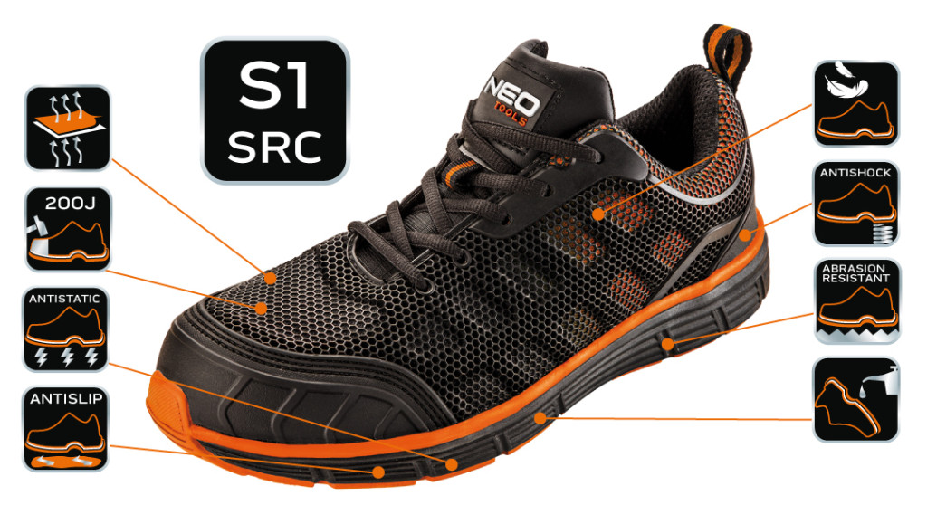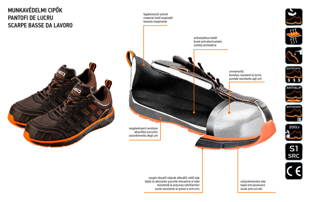 NEO munkavédelmi félcipő. Felsőrésze légáteresztő, műanyag hálóval borított anyagból készül. Csúszásmentesített talpa gumival borított EVA hab. Rezgéscsillapító funkcióval járul hozzá a biztonsághoz és a viselési komforthoz. A műanyaggal megerősített orr és sarok véd a sérülések ellen. A lábbeli belső részének puha kikészítésének köszönhetően kényelmes munkavégzést biztosít. CE tanúsítvánnyal rendelkezik.