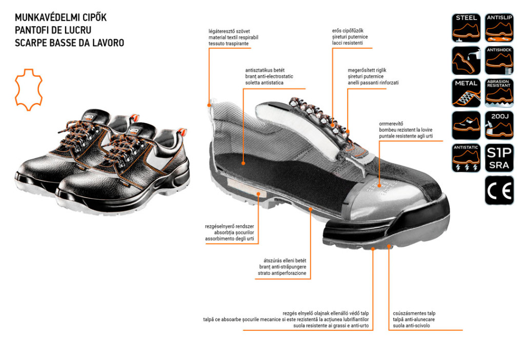 A NEO munkavédelmi cipő alapvető védőeszköz a munkavégzéshez. Felsőrésze kiváló minőségű bőrből készül, viselője láthatóságáról minden körülmények között gondoskodó fényvisszaverő betétekkel rendelkezik. A rezgéselnyelő rendszerrel ellátott csúszásmentes talp gondoskodik a kényelemről és a biztonságról. Az átszúrás ellen védő fém betét és a megerősített fém orrmerevítő véd a sérülések ellen. A lábbeli belső részének puha kikészítésének köszönhetően magas fokú a munkavégzés kényelme. A CE jelölés a biztonság garanciája, bizonyítja, hogy a termék teljesít minden európai uniós követelményt. A NEO márka a professzionális igényeket is kielégíti.