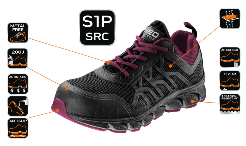 A NEO S1P SRC női munkalcipő.. A lábbeli nagyon kényelmes, nem tartalmaz fémelemeket, ami a cipőt könnyebbé teszi, a fémdetektorok számára észrevehetetlen. Jellemzői: ütéscsillapító rendszerrel ellátott csúszásmentes talp, ellenálló a kopásnak, olajnak-, benzinnek és más szerves oldószereknek. Az üvegszálas megerősítés akár 200 J ütésnek is ellenáll. A kevlárból készült talpbetét átszúrás elleni védelmet biztosít. A cipő könnyű, divatos kialakítású, CE tanúsítvánnyal rendelkezik, és megfelel az EN:ISO 20345:2011 szabványnak. 36-41-es méretben kapható.