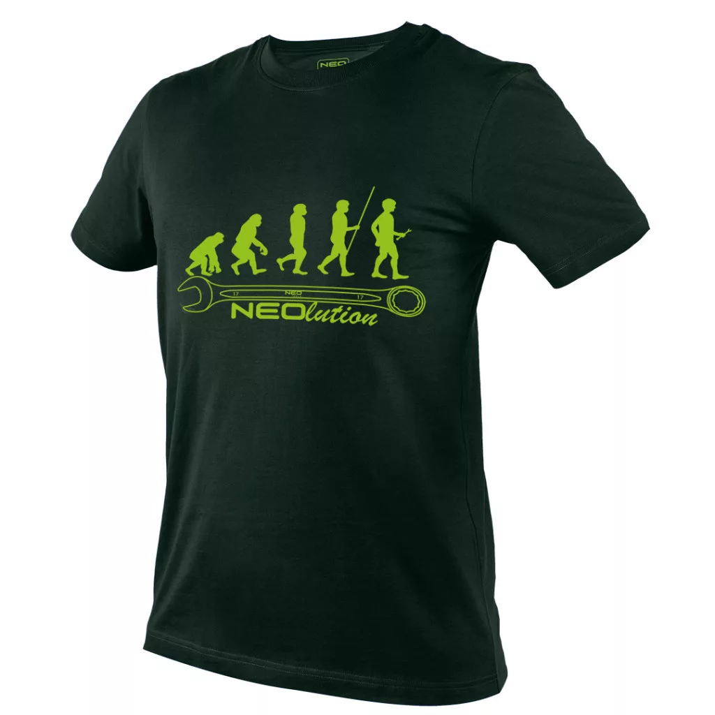 NEOlution grafikával ellátott munkapóló zöld színben. A mellrészen lévő neonzöld nyomtatás az evolúció egyszerűsített rajzát ábrázolja. Rövid ujjú, kerek nyakkivágással. Puha 180 g/m2 (100%)pamutból készült. A márka egyedi dizájnja, teszi ezt a pólót szinte minden alkalomra tökéletes viseletté. CE tanúsítvánnyal rendelkezik.