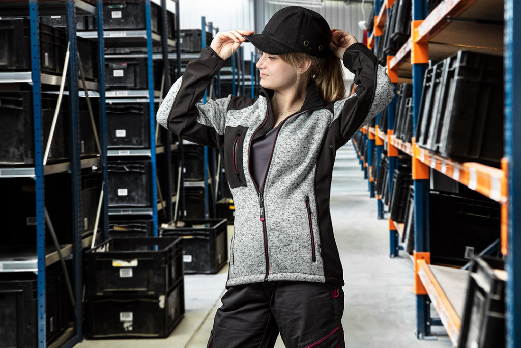 Női kötött munkadzseki, mérete XXL, softshell anyagból erősítve, 3 cipzáros zseb, rugalmas összehúzó zsinór az ujjakban és szabályozható összehúzó a derékban, puha belső bélés, azonosító címke, divatos színek, CE tanúsítvány
