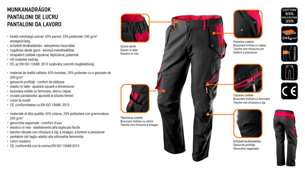 Neo Woman Line munkanadrág termékcsalád, kényelmes megoldást kínál az igényes női felhasználók számára. Kiváló minőségű, vászon szövésű. Pamut-poliészter szövetből készül. A derékban bevart, rugalmas anyagú elemeknek, valamint a speciális felépítésnek köszönhetően a nadrág illeszkedik a női testalkathoz. A speciális térdkialakítás és a nagyméretű zsebek növelik a munka komfortját. A nadrágot kiemeli divatos színe, modern fazonja és szabása. Akár a munkát követően,hétköznapi viseletként is használható. A CE európai tanúsítványa garantálja a termék minőségét. A NEO márka a professzionális igényeket is kielégíti.