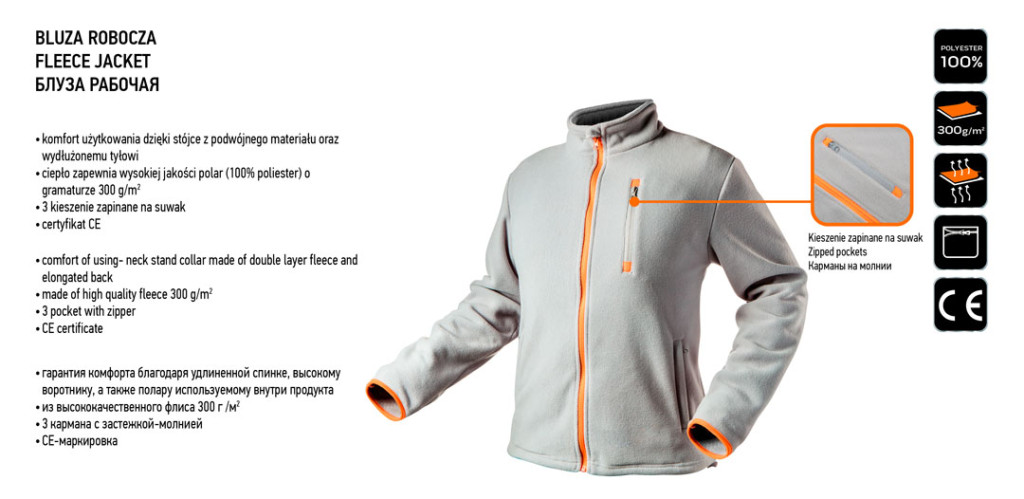 NEO polár munkadzseki könnyű,kényelmes és meleg, komfortot biztosít az alacsonyabb hömérsékleteken végzett munkák során. A pulóvernek három nagy zippzáras zsebe van. A termék DIN 13688:2013 szabvány szerinti kivitelezése és az európai tanúsítványa minőségének garanciája. A CE tanúsítvány igazolja az európai biztonsági normáknak való megfelelést. A NEO márka a professzionális igényeket is kielégíti.