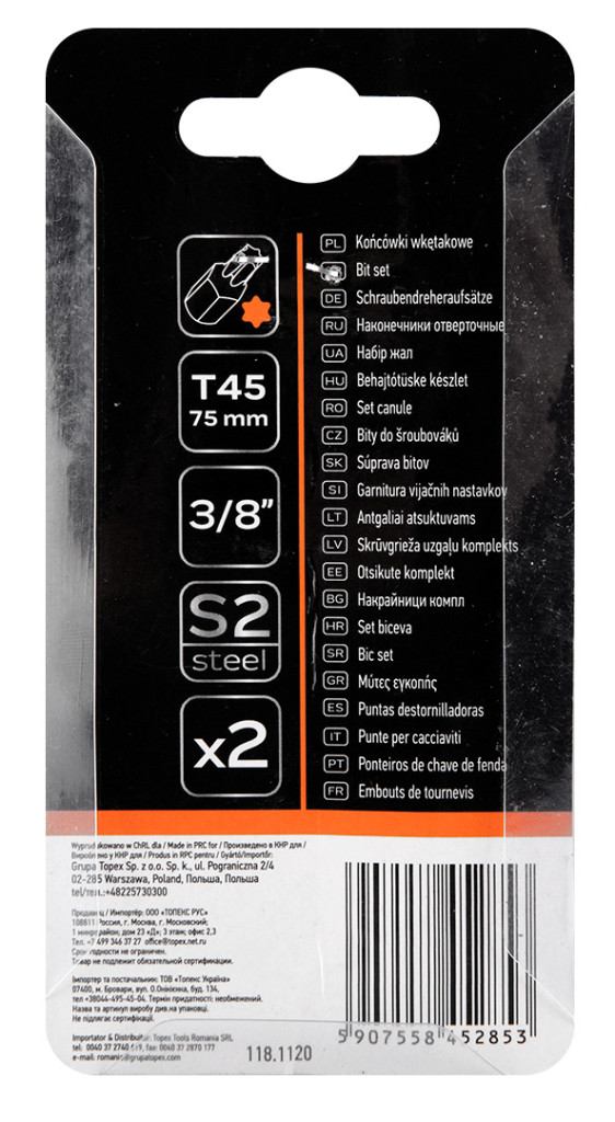 Torx bit, 3/8", T45x75mm, S2, 2db, min. rendelés: 3cs