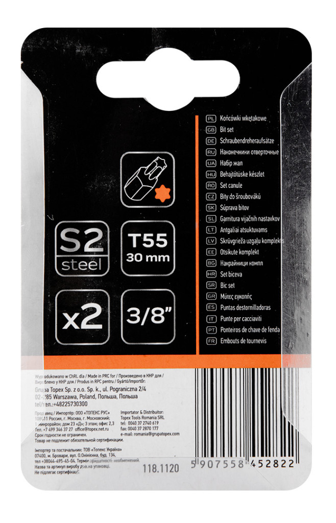 Torx bit, 3/8", T55x30mm, S2, 2db, min. rendelés: 5cs