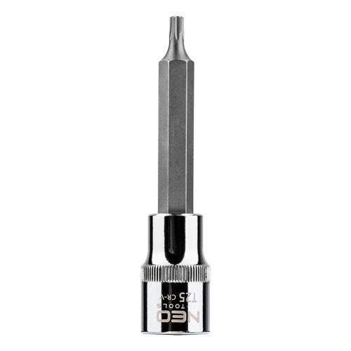 NEO 1/2"-os Torx bit dugókulcs, 100 mm hosszú. A dugóadapter nagy ellenállóképességű króm-vanádium acélból , a Torx bit pedig S2-es acélból készül. A hatlapú bit kiváló minőségű S2 acélötvözetből készül. A szerszám minőségét bizonyítja a TÜV tanúsítvány és a gyártó által nyújtott 25 éves jótállás. A NEO márka a professzionális igényeket is kielégíti.