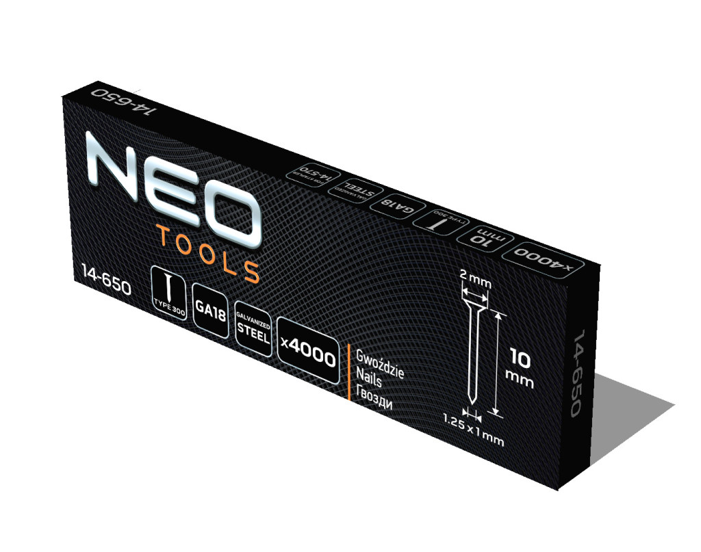 Tűzőszeg 300 (F) tipus. Acélhuzalból készült, galvanizált, korrózióálló szeg. NEO 14-570 pneumatikus tűzőgéphez készült. 300 (F) , GA 18 típus. 4000 darabos kiszerelésben. Mindenféle pneumatikus tűzőgéppel végzett munkához ajánlott szeg. Alkalmas professzionális felhasználásra.