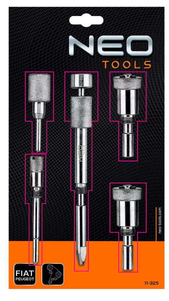 Neo vezérműtengely blokkoló készlet Fiat/Peugeot dízelmotorkhoz. A készlet a dízelmotorok vezérműtengelyének blokkolásához szükséges elemeket tartalmazza. Alapvető eszközöket biztosít a motor vezérműbeállításához és reteszeléséhez.