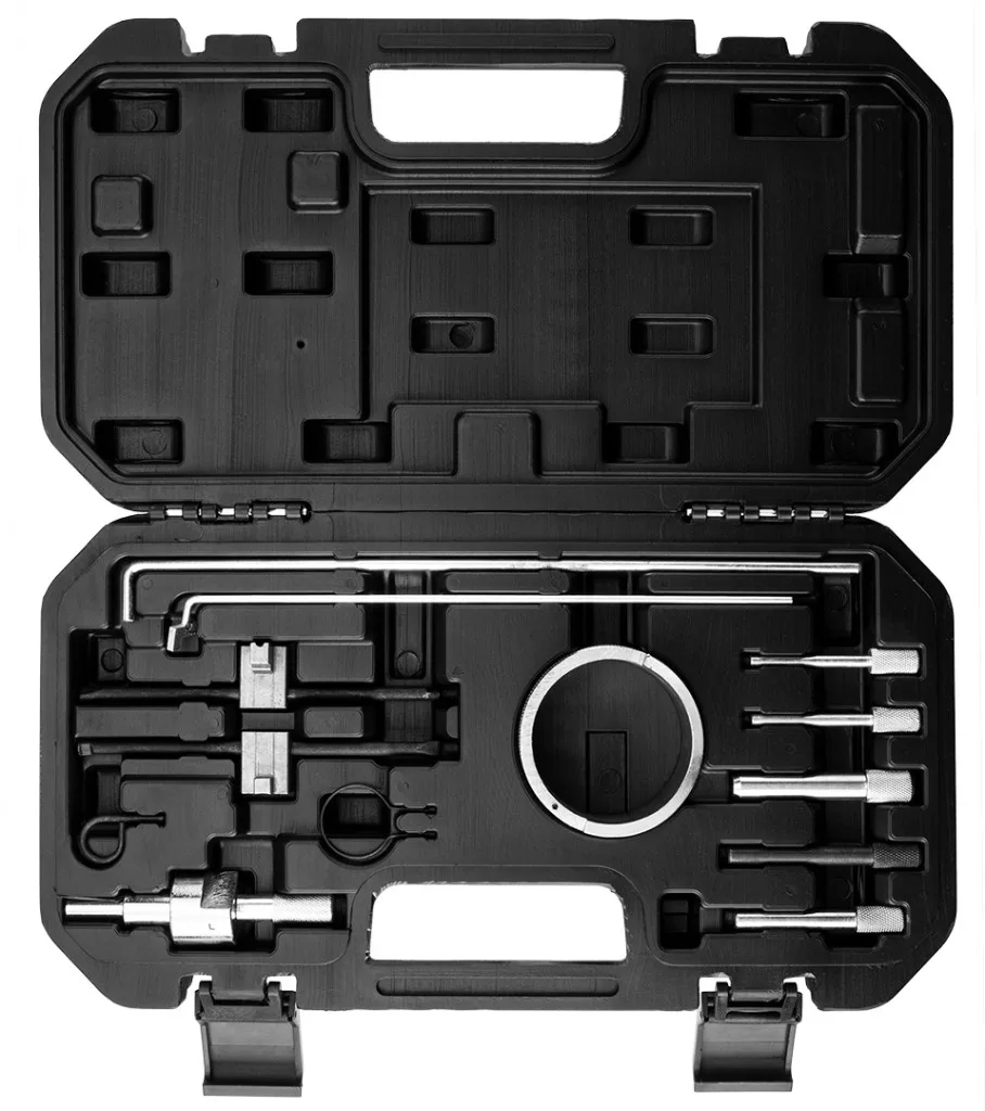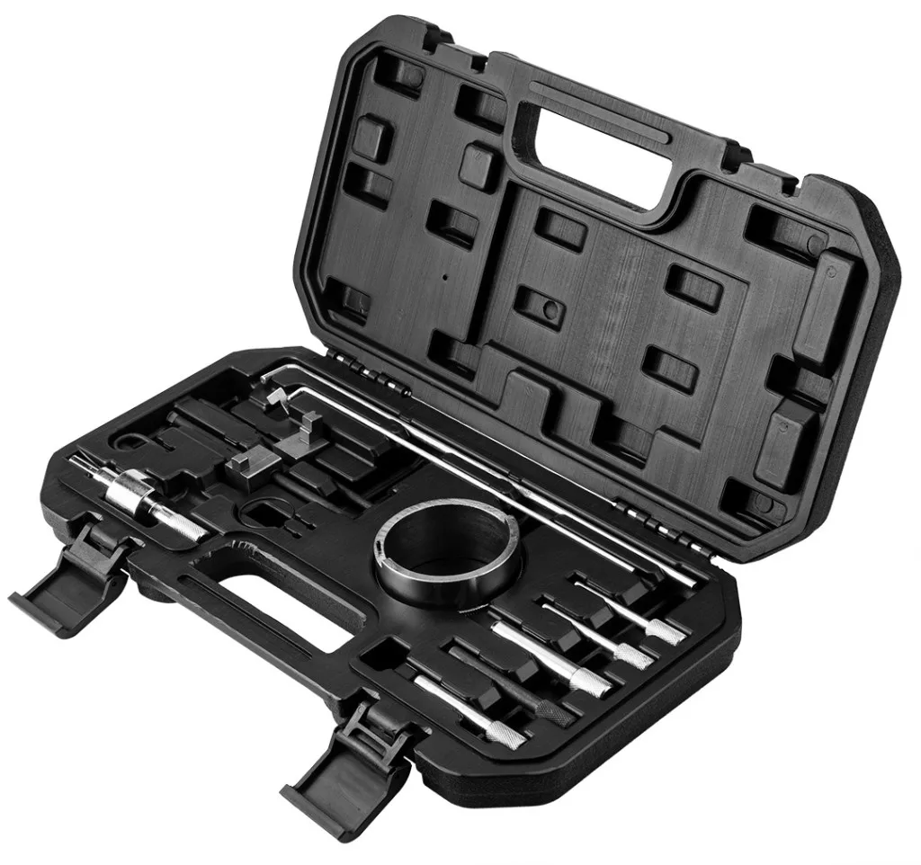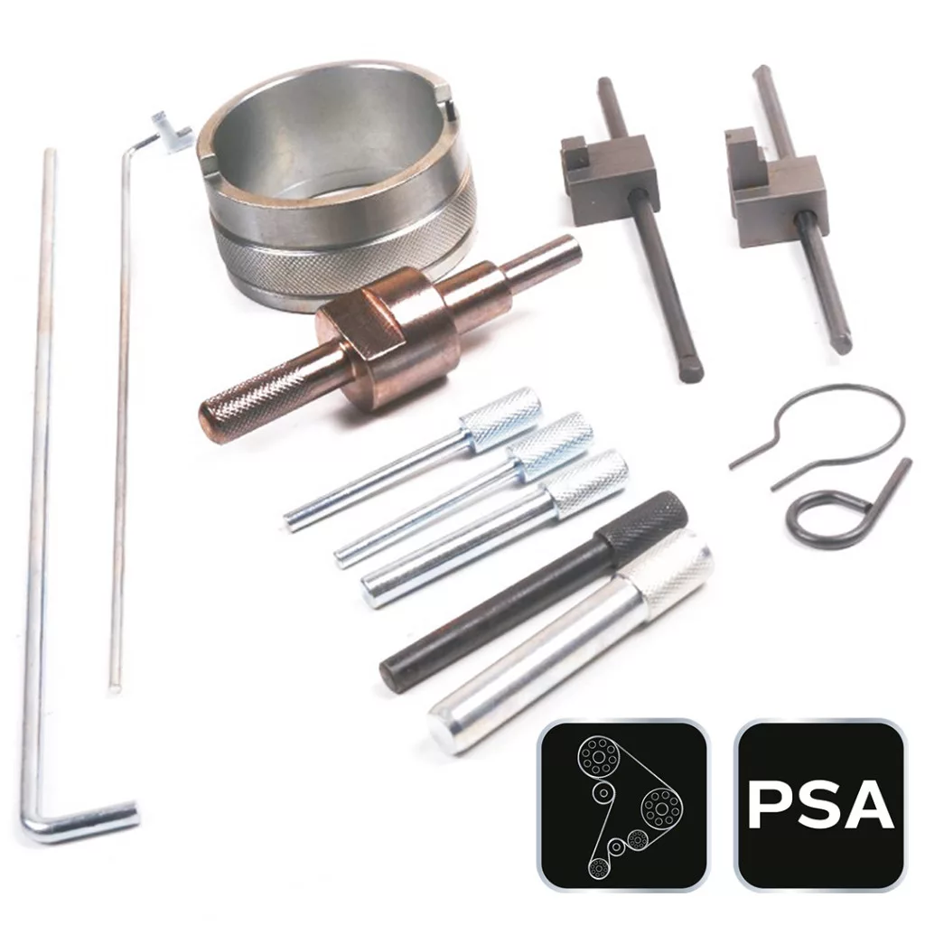 Neo vezérműtengely blokkoló készlet PSA benzinmotorkhoz. A készlet a benzinmotorok vezérműtengelyének blokkolásához szükséges elemeket tartalmazza. Alapvető eszközöket biztosít a motor vezérműbeállításához és reteszeléséhez. A készlet műanyag kofferbe van csomagolva.