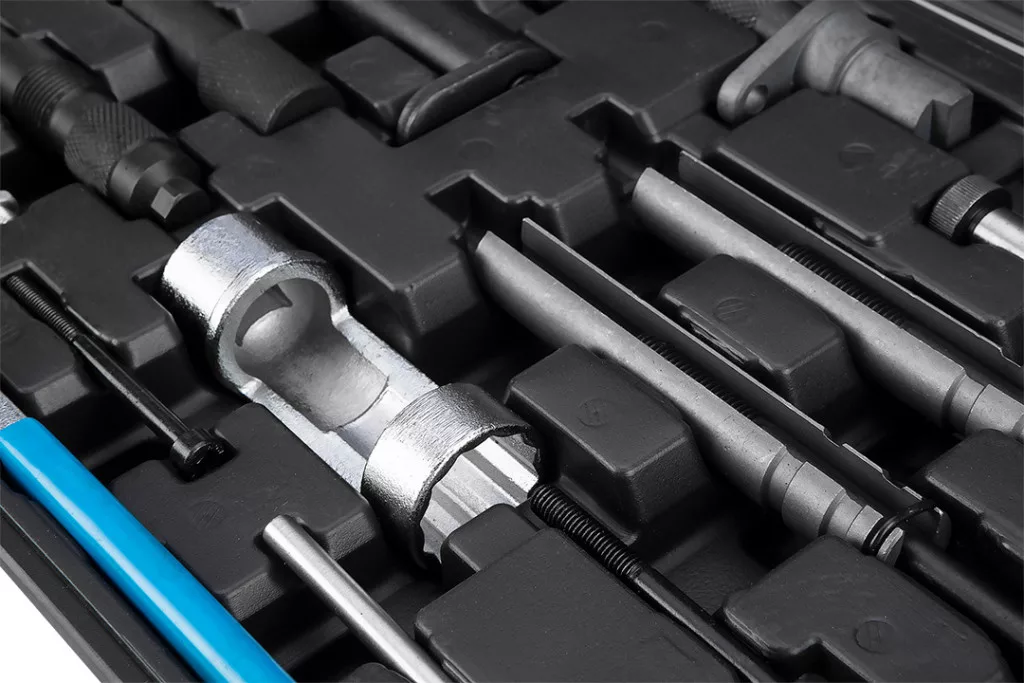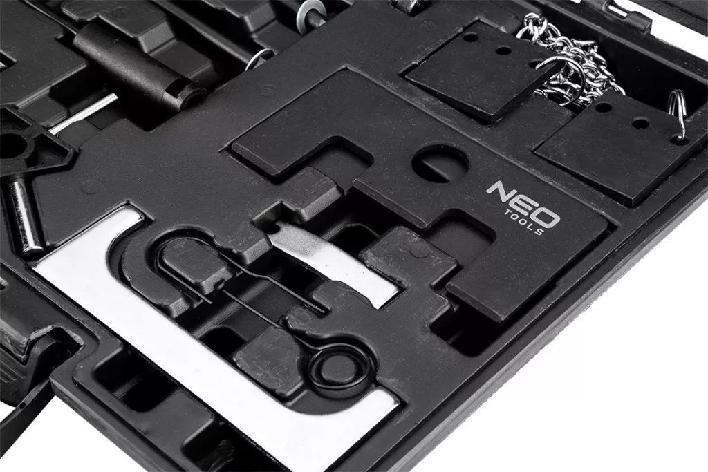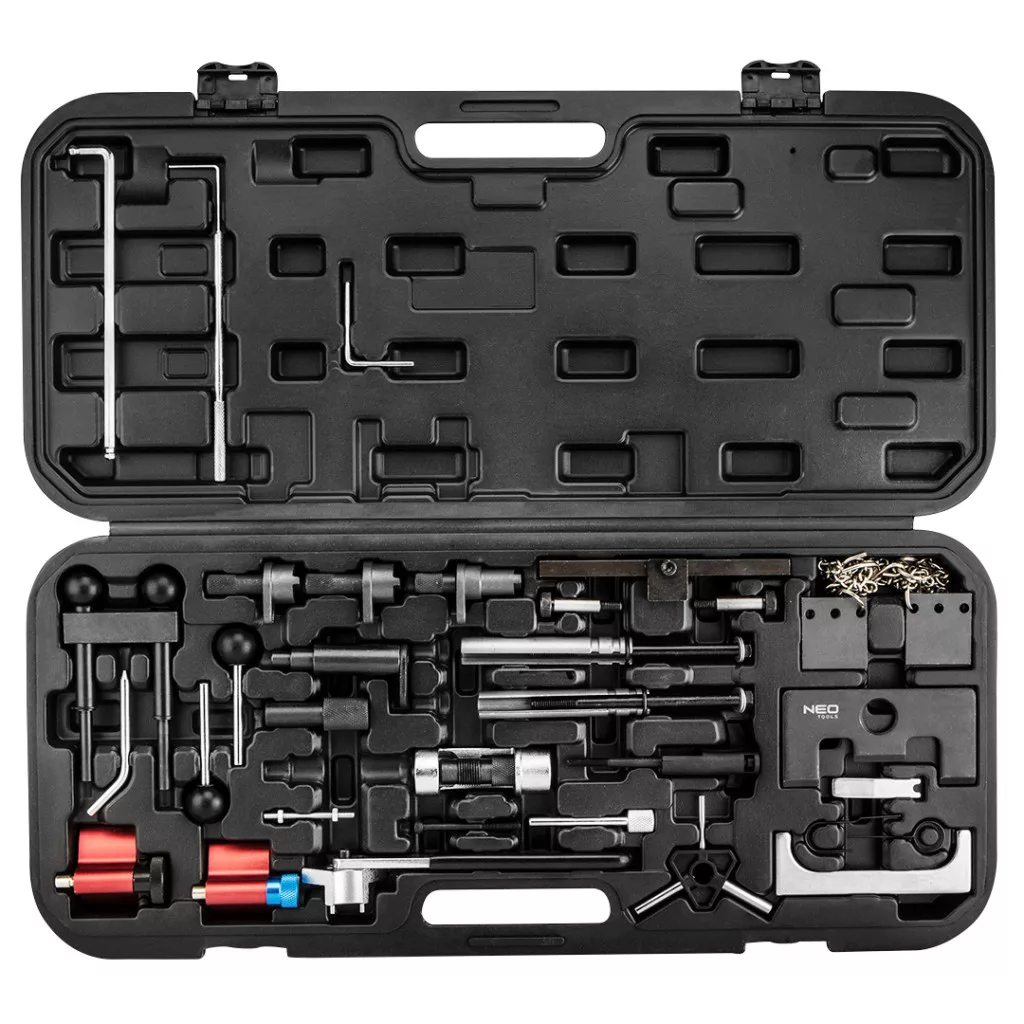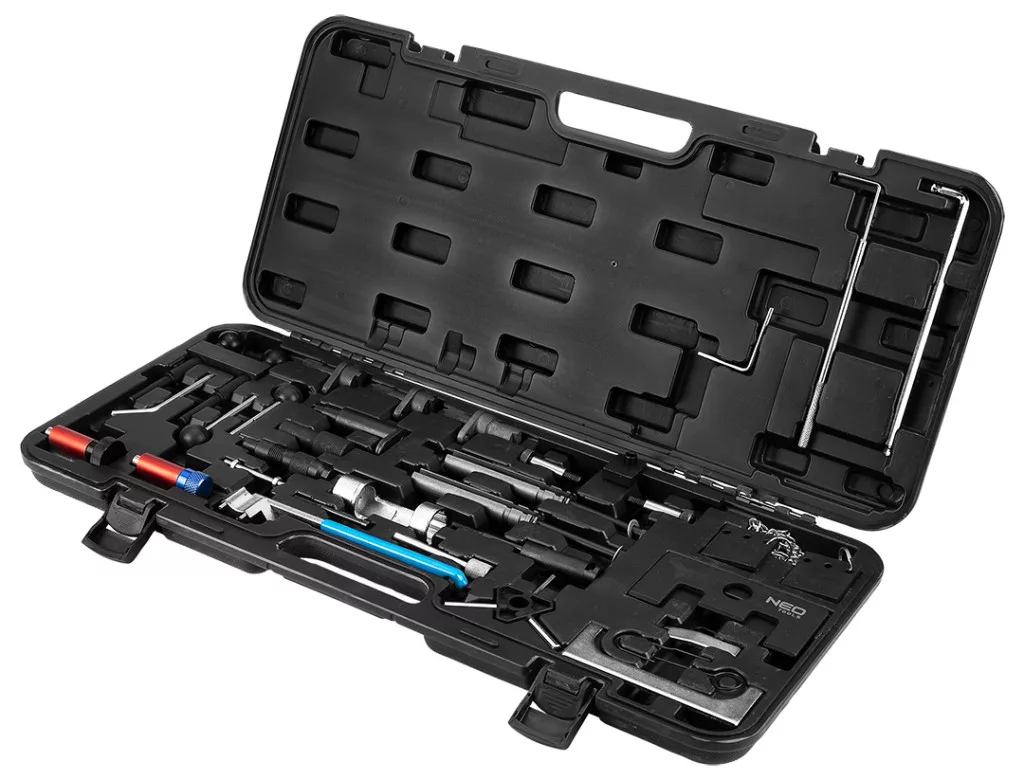 NEO vezérműtengely blokkoló készlet VAG benzin és dízelmotorokhoz. A készlet a benzin- és dízelmotorok vezérműtengelyeinek blokkolásához szükséges elemeket tartalmazza. Alapvető szerszámokat biztosít a motorok vezérműbeállításához és reteszeléséhez. A készlet műanyag kofferbe van csomagolva.