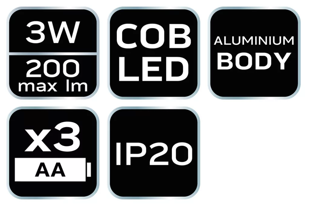 Zseblámpa, elemes 3xAA, 200lum, COB LED, 3W