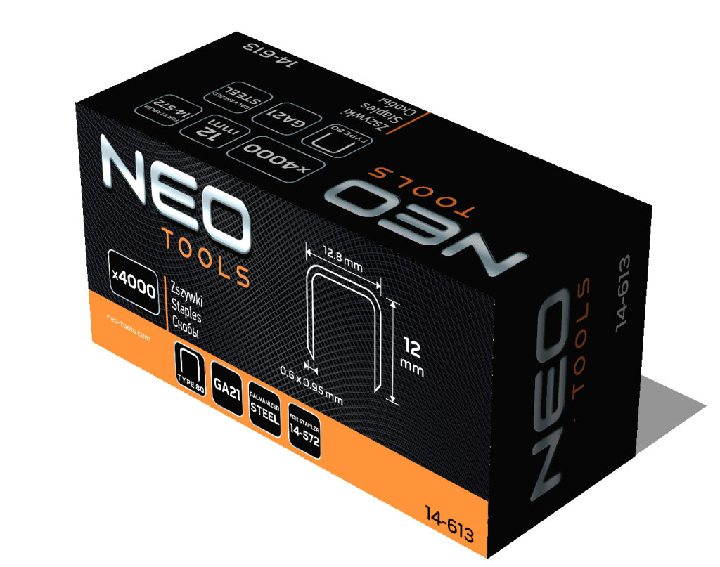Tűzőkapocs "80" tipus. Acélhuzalból készült, galvanizált, korrózióálló kapocs. A NEO 14-572 pneumatikus tűzőgéphez készültek. 80-as (380-as) típus, GA21. 4000 darabos kiszerelésben. Mindenféle pneumatikus tűzőgéppel végzett munkához ajánlott tűzőkapocs. Alkalmas professzionális felhasználásra.