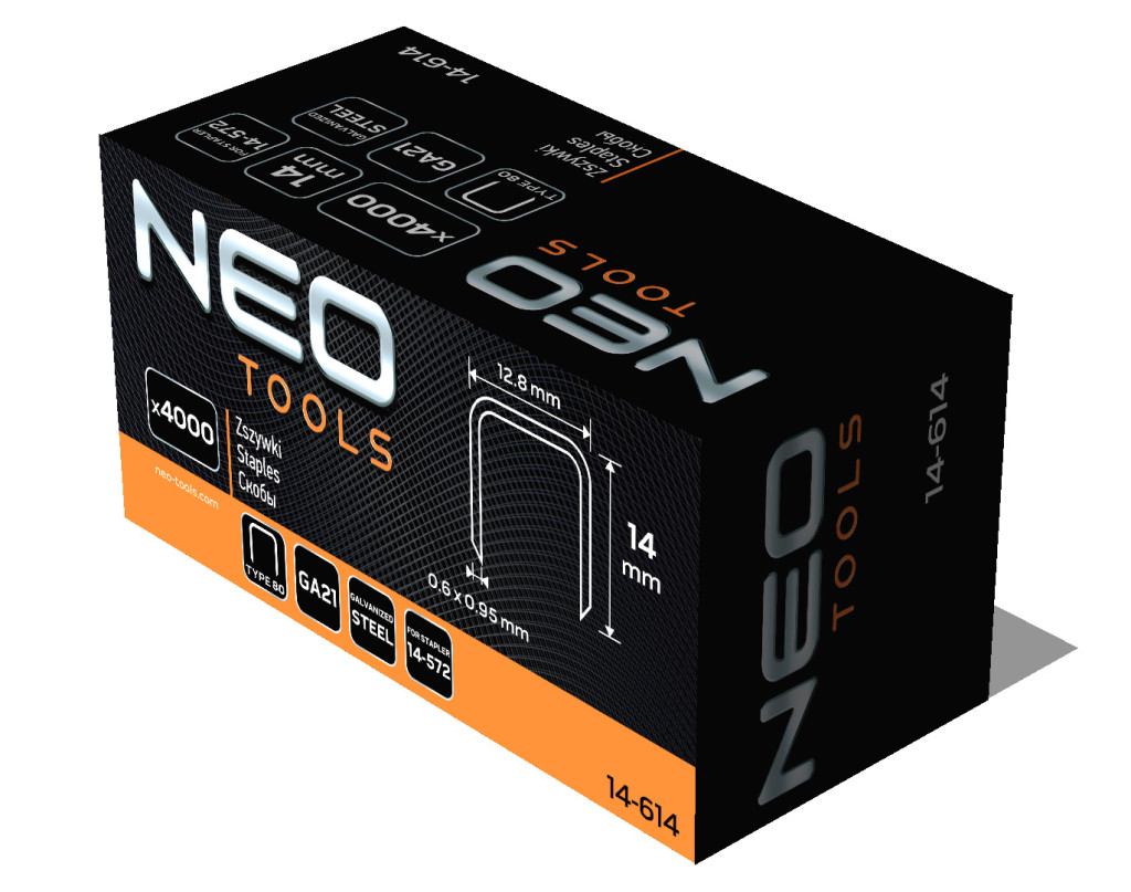 Tűzőkapocs "80" tipus. Acélhuzalból készült, galvanizált, korrózióálló kapocs. A NEO 14-572 pneumatikus tűzőgéphez készültek. 80-as (380-as) típus, GA21. 4000 darabos kiszerelésben. Mindenféle pneumatikus tűzőgéppel végzett munkához ajánlott tűzőkapocs. Alkalmas professzionális felhasználásra.