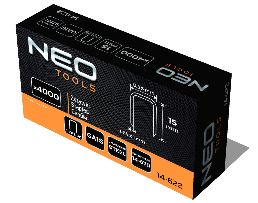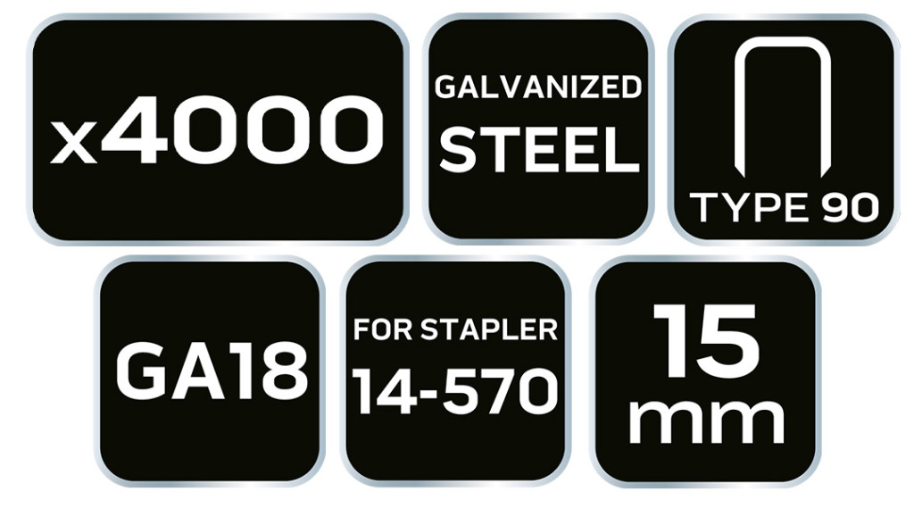 Tűzőkapocs "90" tipus. Acélhuzalból készült, galvanizált, korrózióálló kapocs. A NEO 14-570 pneumatikus tűzőgéphez készültek. 90-es típus, GA18. 4000 darabos kiszerelésben. Mindenféle pneumatikus tűzőgéppel végzett munkához ajánlott tűzőkapocs. Alkalmas professzionális felhasználásra.