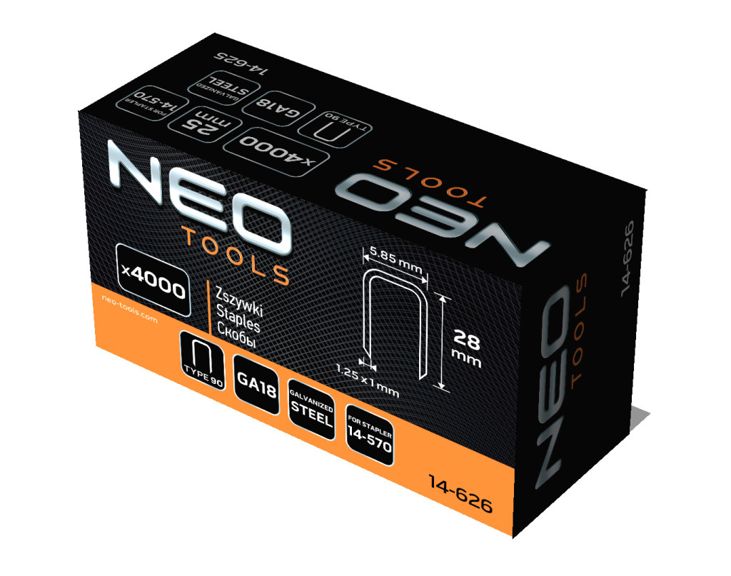 Tűzőkapocs "90" tipus. Acélhuzalból készült, galvanizált, korrózióálló kapocs. A NEO 14-570 pneumatikus tűzőgéphez készültek. 90-es típus, GA18. 4000 darabos kiszerelésben. Mindenféle pneumatikus tűzőgéppel végzett munkához ajánlott tűzőkapocs. Alkalmas professzionális felhasználásra.