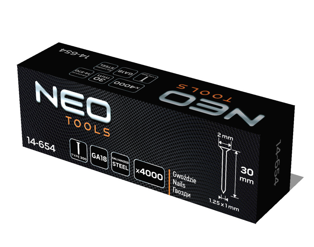 Tűzőszeg 300 (F) tipus. Acélhuzalból készült, galvanizált, korrózióálló szeg. NEO 14-570 pneumatikus tűzőgéphez készült. 300 (F) , GA 18 típus. 4000 darabos kiszerelésben. Mindenféle pneumatikus tűzőgéppel végzett munkához ajánlott szeg. Alkalmas professzionális felhasználásra.