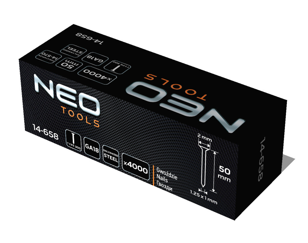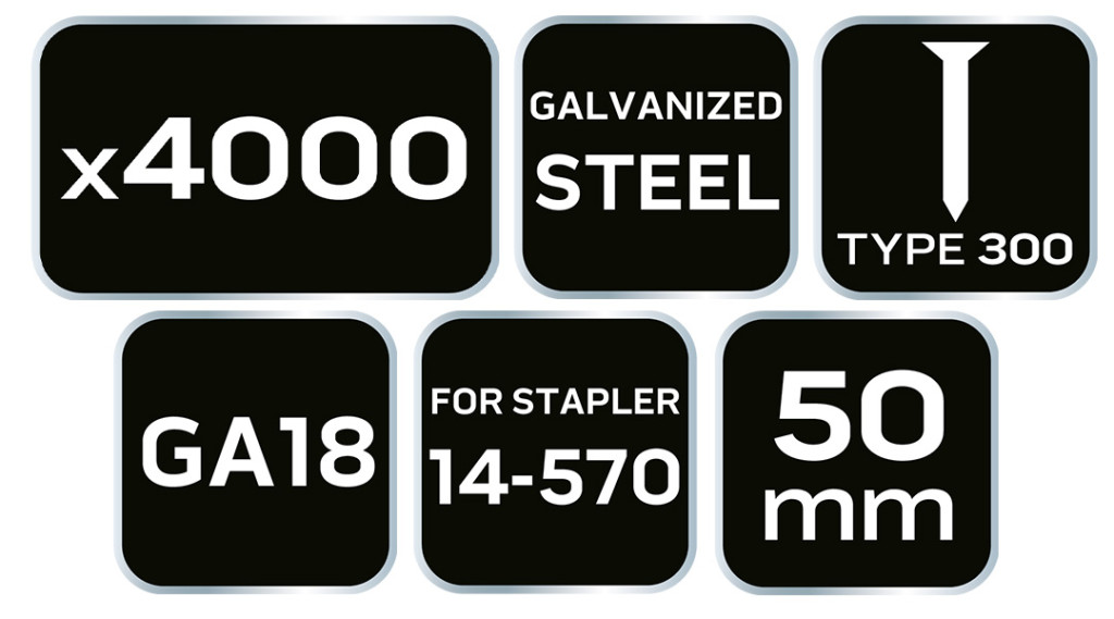 Tűzőszeg 300 (F) tipus. Acélhuzalból készült, galvanizált, korrózióálló szeg. NEO 14-570 pneumatikus tűzőgéphez készült. 300 (F) , GA 18 típus. 4000 darabos kiszerelésben. Mindenféle pneumatikus tűzőgéppel végzett munkához ajánlott szeg. Alkalmas professzionális felhasználásra.