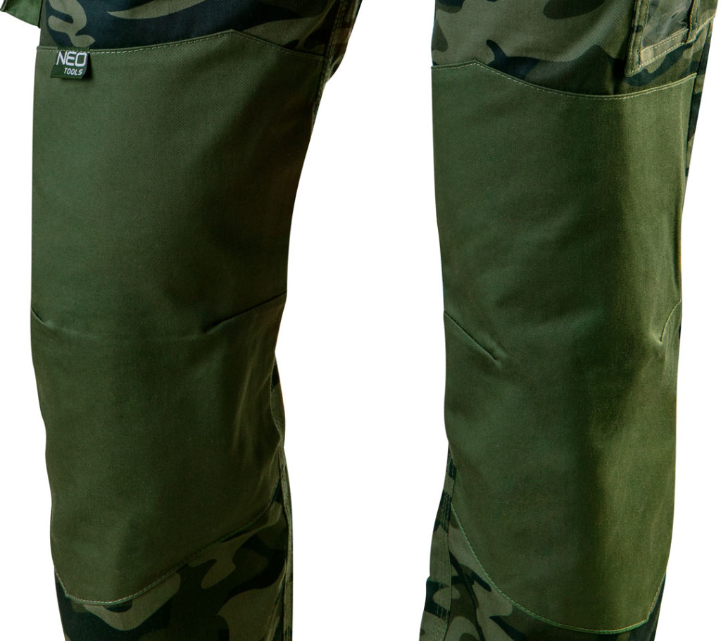 NEO munkanadrág, CAMO termékcsalád része. Kiváló minőségű pamut-poliészter szövetből készül. A profilozott térd a megerősített térd része strapabíró, A kényelmes zsebek lényegesen növelik a munka komfortját. A rugalmas anyagú derék révén a méret könnyebben illeszkedik. A dupla belső varrás növeli a szakadással szembeni ellenállást A nadrágot kiemeli terepmintázata. A divatos színe és modern fazonja lehető teszi a termék munka utáni viselését. A CE európai tanúsítványa garantálja minőségét. A NEO márka a professzionális igényeket is kielégíti.