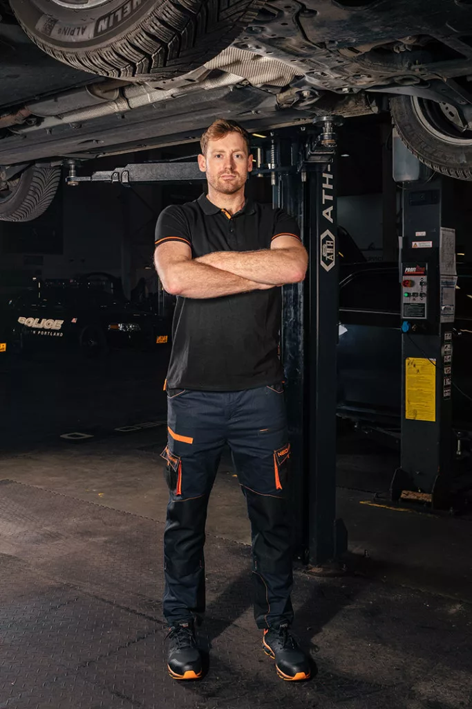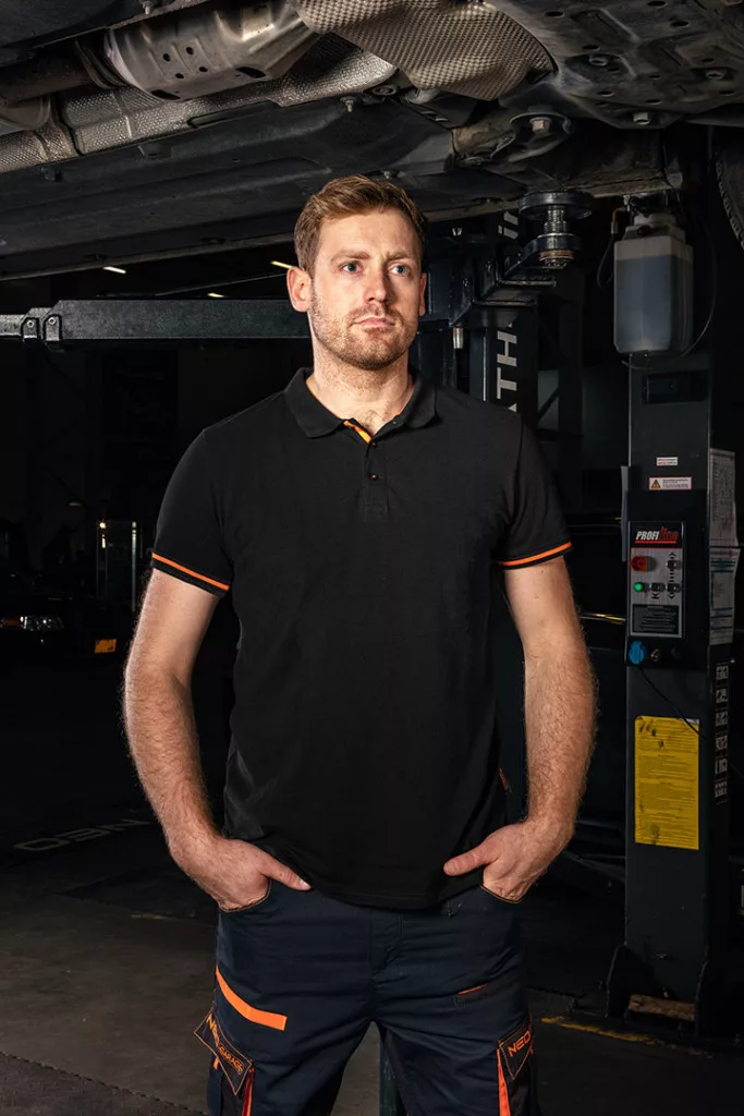 Munkavédelmi póló, fekete, galléros, Garage, pique, 100% pamut, 195g/m2, M