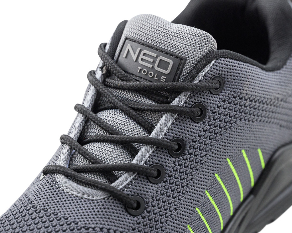 NEO 82-162 Munkavédelmi cipő, S1 FO, textil felsőrész, acélbetét, csúszásmentes talp. S1 FO védőkategóriájú lábbeli, amelyet 200J energiájú ütésekkel szembeni védelmet nyújtó, olajokkal, benzinnel és más szerves oldószerekkel szembeni ellenálló képesség jellemez. A NEO TOOLS munkacipő robusztus acél orrmerevítéssel, flyknit kötött felsőrésszel és kötött "hálós" béléssel rendelkeznek. A cipő PU/PU talppal és EVA habszivacs talpbetéttel is fel van szerelve. A fém lábfejvédő védi a lábat a sérülésektől. A NEO TOOLS flyknit típusú munkacipő felsőrésze egyetlen anyagból készül, ami hozzájárul a könnyű felépítéshez és a lábbeli nagyon jó illeszkedéséhez a lábfejhez. A termék az EN ISO 20345 szabványnak megfelelően CE tanúsítvánnyal rendelkezik.
